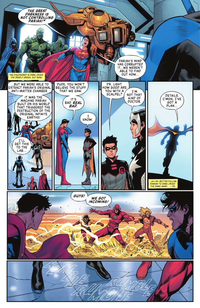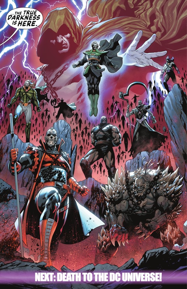 這個星期,幾年內第三度試圖重整DC宇宙的大事件《無限地球黑暗危機》(Dark Crisis on Infinite Earths)來到了第五回。黑亞當(Black Adam)試圖尋求末日軍團(Legion of Doom)的協助,卻落得他們完全被喪鐘(Deathstroke)的祕密結社給感染成黑暗大軍的下場。