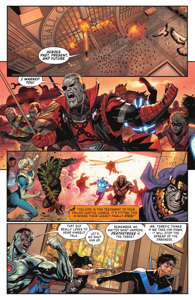 卓越先生的推測沒錯,祕密結社的攻擊正是散播黑暗的源頭;而夜翼認為要終結這一切,唯一的方法就是搶先召集所有剩下的超級英雄,主動向喪鐘開戰。