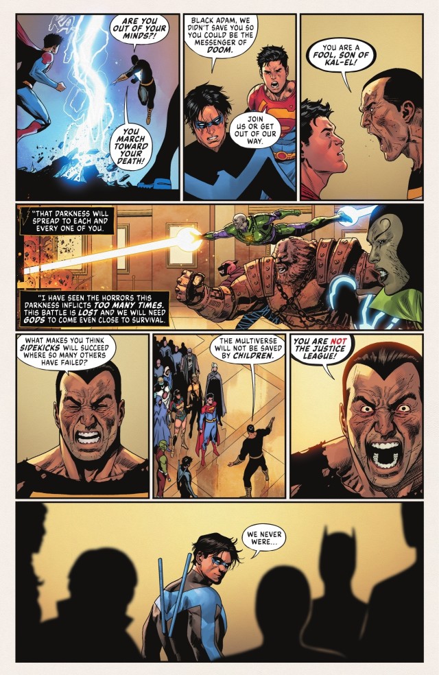 黑亞當在見證了正義聯盟與末日軍團的下場之後,完全不認為這批屁孩軍團有任何一點機會取勝。「你們不是正義聯盟!」