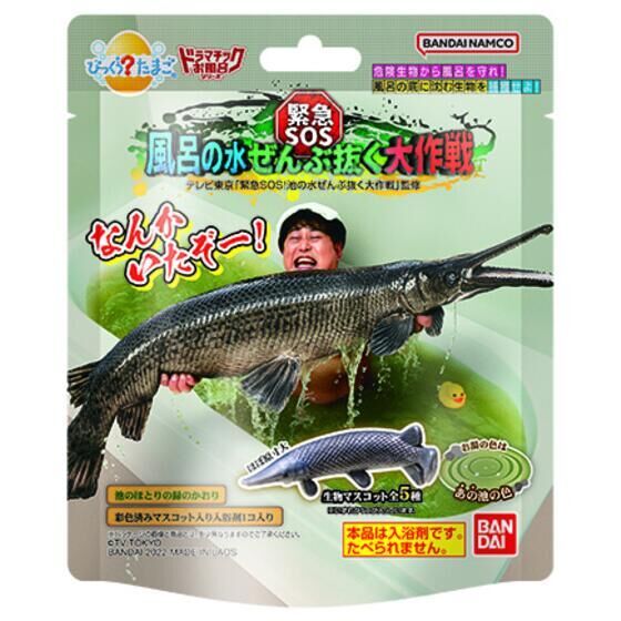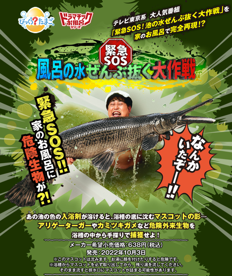 日本萬代玩具公司為紀念 2002 年推出的入浴劑型玩具 品牌「驚奇蛋(びっくらたまご)」發售 20 周年,展開全新的「大人們的內心小劇場系列(ドラマチックお風呂シリーズ)」系列,繼「鋼普拉」合作商品之後,再度攜手日本人氣綜藝節目《緊急SOS!池水抽光好吃驚》,推出讓浴缸陷入一片混亂的話題新作「緊急SOS!浴缸水抽光大作戰(暫譯)」泡澡球!