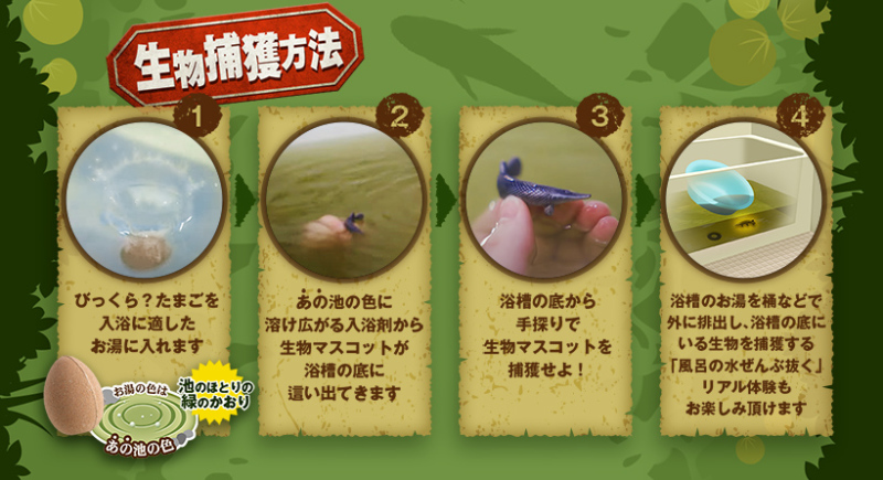 而本次的「驚奇蛋 緊急SOS!浴缸水抽光大作戰」泡澡球,實現各位玩具人們想要抽光池水的願望!讓你可以把家中浴缸變成淤泥未清的池水顏色!(這應該不是重點)當所有浴鹽溶解後,浴缸化成髒髒的池水綠色,驚奇蛋內藏的危險生物小玩具將沉入浴缸底部,一邊泡澡一邊摸索的同時,還能享受著節目般的體驗~一共收錄有五種在節目中被從池水移除的生物:福鱷、非洲爪蟾、大鱷龜、擬鱷龜、瓦片&青鱂魚,請將他們一一驅逐吧!(※同時也要注意會被共用衛浴的家人、另一半驅逐的風險)