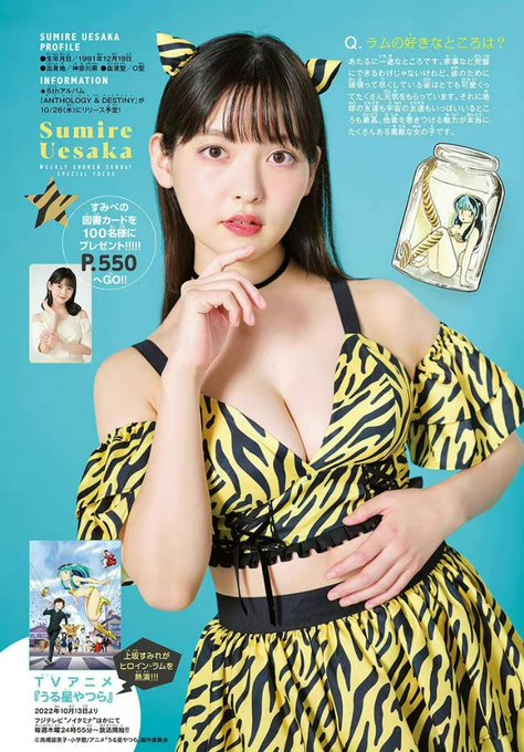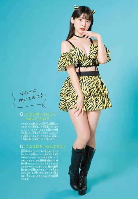 這次是為了協力宣傳《福星小子》新作動畫即將開播,特別在最新一期的《少年Sunday周刊》拍攝內頁宣傳,穿上類似「拉姆風服裝」拍攝,雖然不像是動漫裡的拉姆布料這麼少 ( ? ),不過上坂堇的好身材也不會因為服裝就被包住,還是給大家滿滿的眼福 XD。