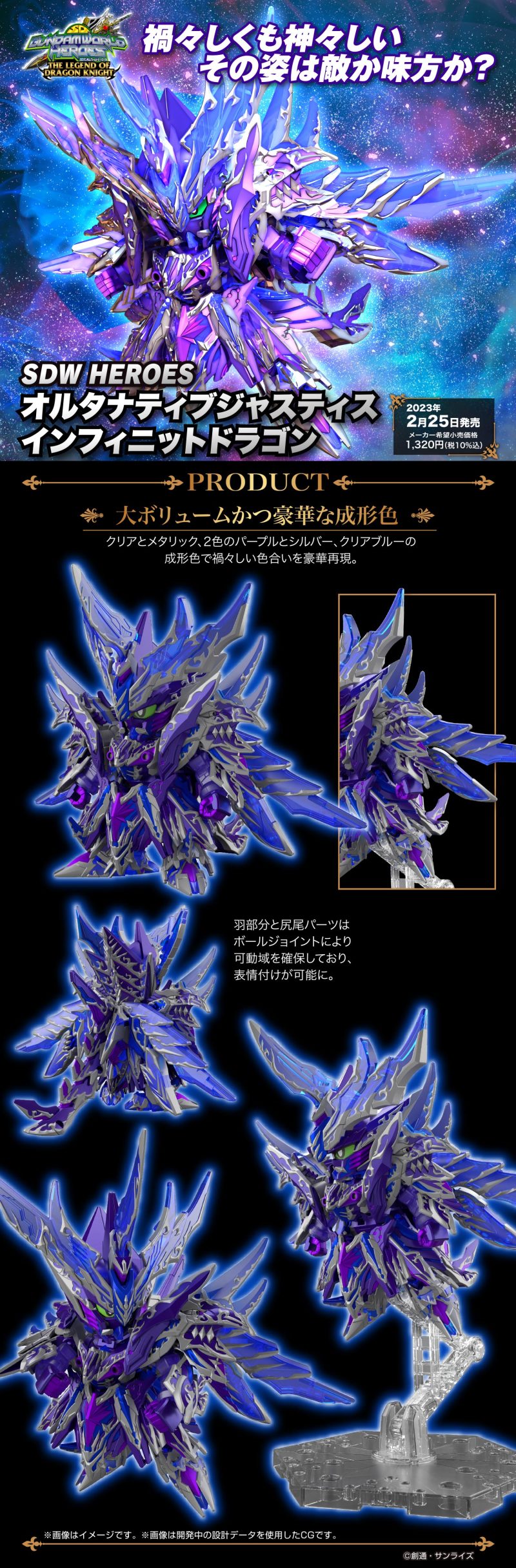 「SDW HEROES 無限正義異變龍」運用金屬紫、透明紫、銀色、透明藍等多色成形零件再現其具備災禍感的優美造型,還原裝甲邊緣華麗的雕紋造型,背部的翅膀與尾巴能藉由球形關節擺動。