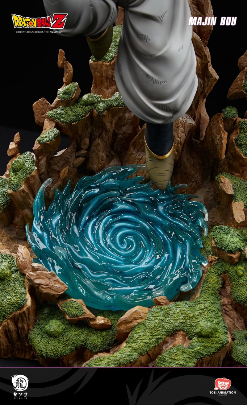 本次以 69 公分高度魄力雕像化的「魔人普烏」是根據他變成純粹普烏後的模樣為題設計,採用樹脂、PU、ABS 為材料打造,並展現出他高舉右臂、準備以紫紅色能量光球毀滅地球的姿態,居高臨下的壞笑看起來十分邪惡!除了考究還原特色頭部、粉紅身體、寬鬆長褲,以及漫畫筆觸之外,遍佈全身的陰影塗裝也充分傳達出魔人普烏的恐怖,底座部分是產生了水藍色漩渦特效的山崖地形,擁有逼真的岩石紋理刻畫與植被,點亮位於能量光球裡頭的 LED 發光裝置,使整體展示起來更具張力!