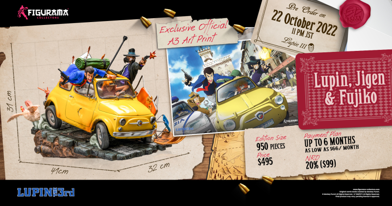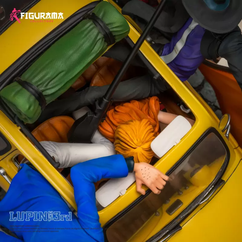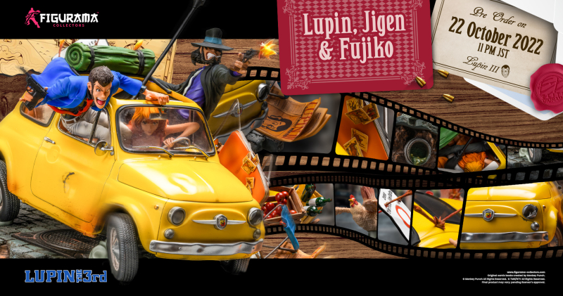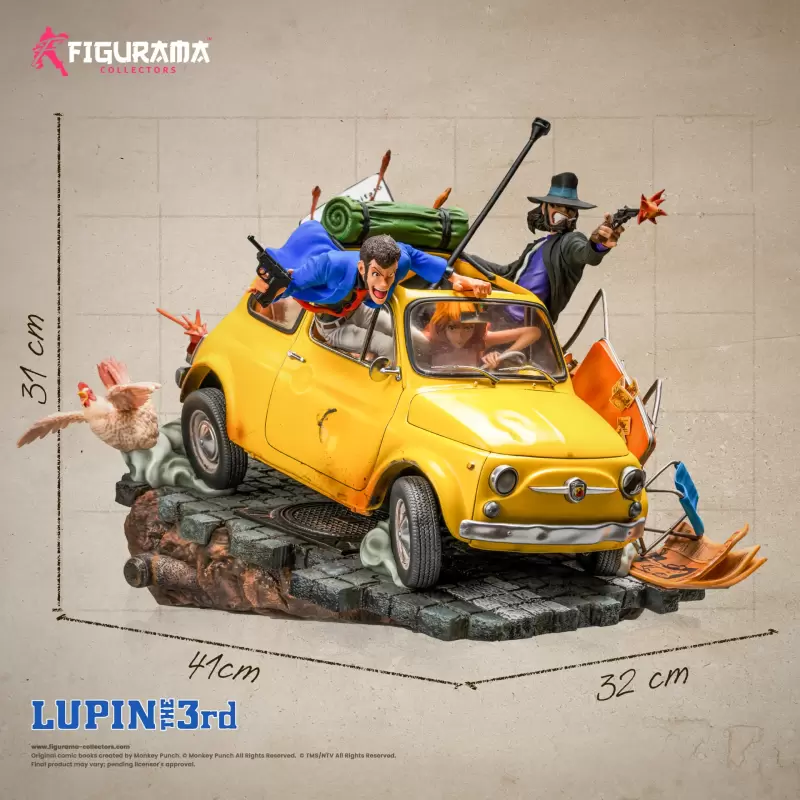 「Figurama Collectors 魯邦 次元 & 不二子」1/8比例場景雕像,尺寸全高約 32 公分,以劇場版《魯邦三世 義大利遊戲》為靈感,將不二子駕駛著魯邦標誌性的黃色愛車 FIAT 500 在義大利的街道上飆速的場面立體化。利用打在車上的彈火、車輪下的煙霧等特效件打造出驚心動魄的追捕刺激感,魯邦與次元一邊巧妙地避開子彈並對追捕者發動攻擊!地台上散落的椅子、通緝魯邦的報紙都生動刻畫。