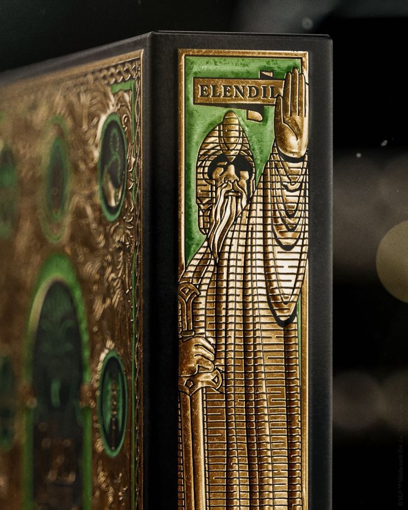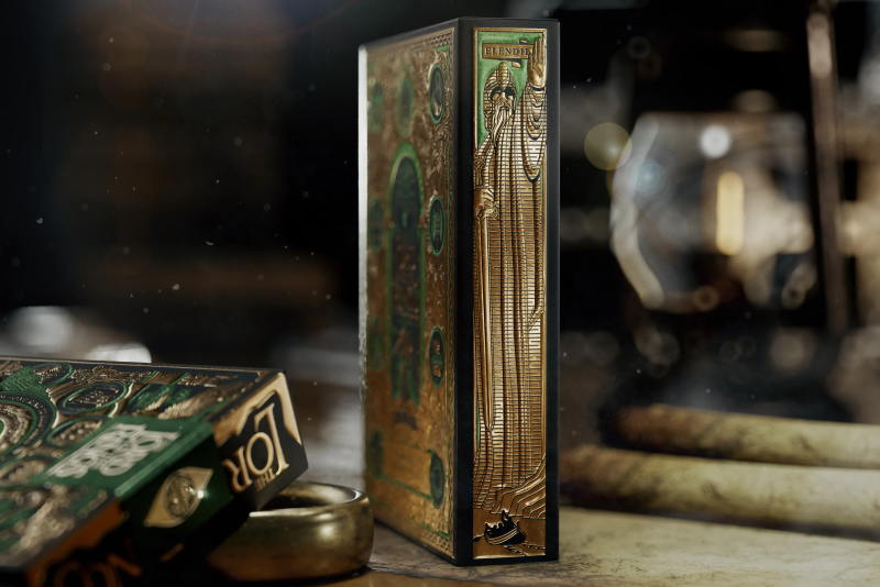 「魔戒收藏撲克牌」的外包裝是以金、綠、黑色為主調,在表現出奢華質感的同時注入大量經典的《魔戒》元素,包含甘道夫、咕嚕、裡頭有著「炎魔」的摩瑞亞礦坑都靈之門、納希爾聖劍,以及浮現出黑暗語談格瓦文字(Tengwar)的至尊魔戒,魔戒內圈是代表索倫的魔眼、外圈則是英文版本的詩文,而在側邊則有手握納希爾聖劍的「伊蘭迪爾」巨型雕像,也就是壯麗的王之柱「亞苟那斯」!光是包裝就讚到不行。