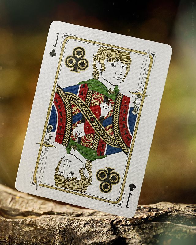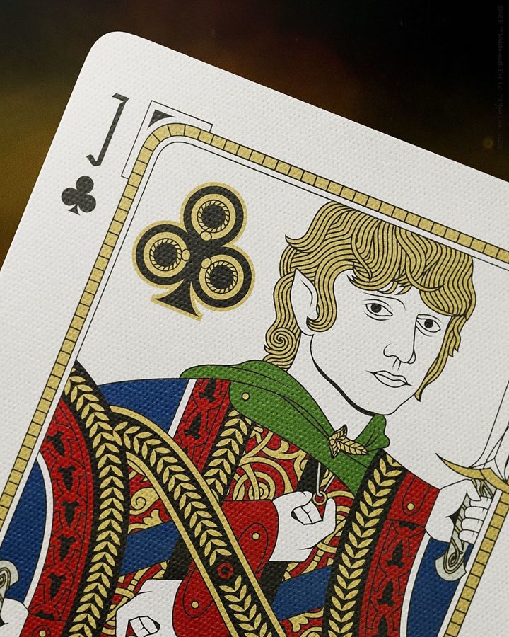 接著看到撲克牌部分,卡背是與包裝盒走相同設計風格但不同樣式的印刷,而卡面的花色、JQK 則是採用《魔戒》故事的元素重新詮釋,包含黑桃A 裡頭的聖白之城「米那斯提力斯」、作為黑桃K 的人皇「亞拉岡」、梅花K 的精靈弓箭手「勒苟拉斯」,心地善良、總是盡自己最大努力支持佛羅多的「山姆衛斯·詹吉」則是化身為梅花J,整體真的是相當精美,極具收藏價值!