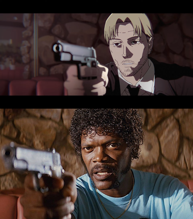 在《鏈鋸人》片頭影像,岸邊舉槍的畫面,正是致敬了山繆·傑克森所扮演的「 朱爾·溫菲德」舉槍的這一幕。