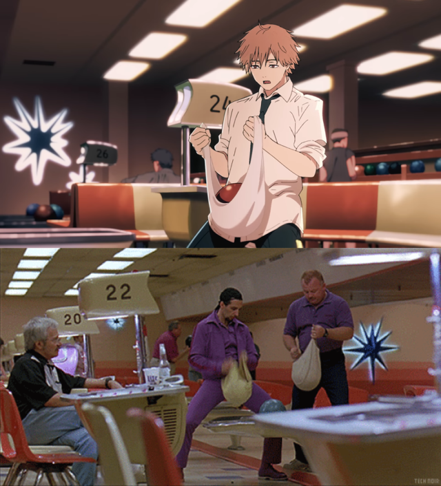 1.《謀殺綠腳趾》(The Big Lebowski),1998年所推出的美國喜劇電影,並由柯恩兄弟(Coen Brothers)雙雙擔任導編。而《鏈鋸人》片頭曲影像裡的「蛋蛋打蠟】,正是出自於該部電影。