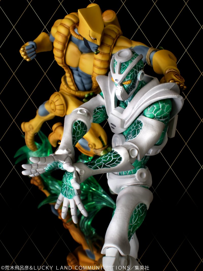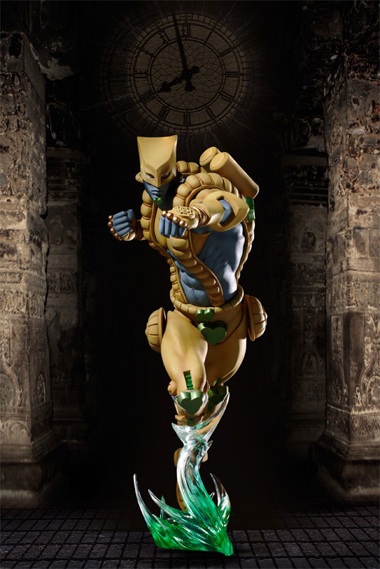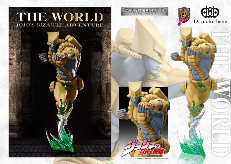 本次將大人氣的「雕像傳說 世界」以全新包裝再販推出,尺寸約為高 160 mm,還原DIO的替身世界魄力的造型,將經典的突進姿態立體化,壯碩的人型替身,搭配與DIO相似的一身黃綠配色,特色的雙脊形氣管、心形裝飾等皆如實呈現;底部以漸層的透明材質打造出躍動的特效效果!