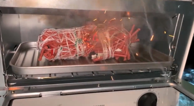 這裡推主有特別說明,一旦點火就要趕快把烤箱的門關上,以策安全。不過這次推主不曉得是不是特地忘了關門......眼前的視界很快就被接連爆炸的火光和黑煙填滿www