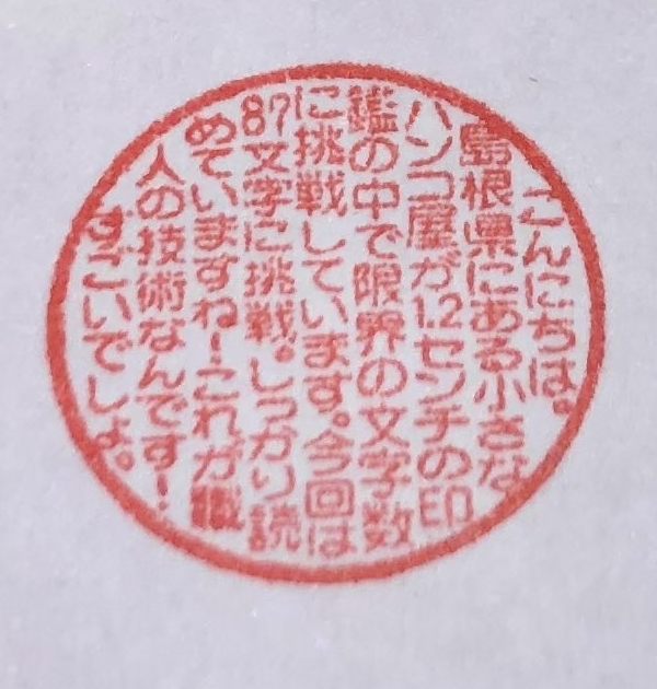 「大家好,我們是島根縣的小小印章店,正在挑戰在1.2公分的印面上最多可以刻上多少字。這次挑戰的是87個字,即使刻了這麼多字,也可以看得很清楚對吧!這就是職人的技術!很厲害吧。」