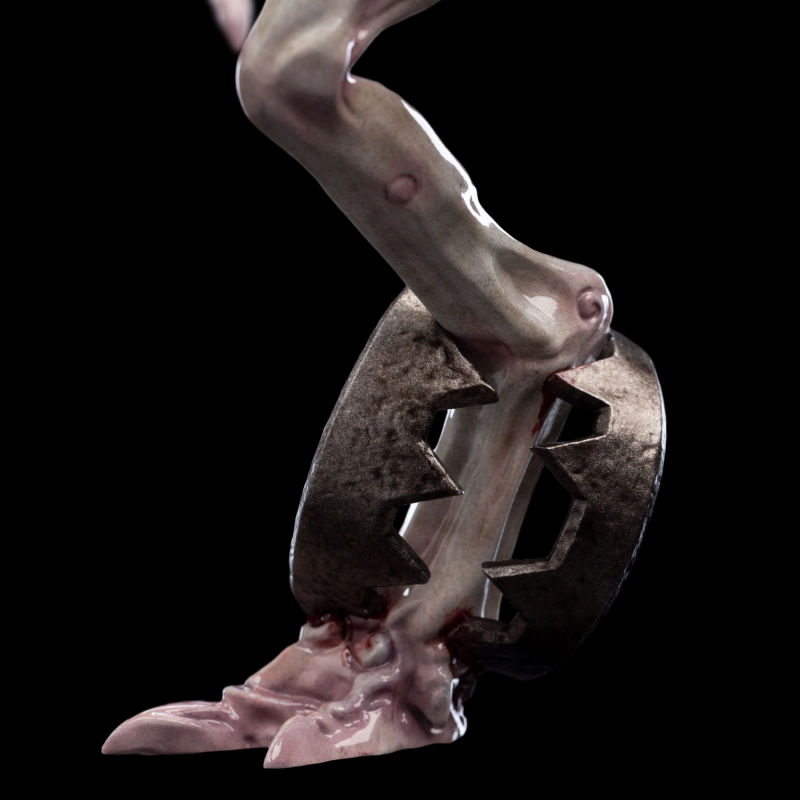 「MINI EPICS 受傷的魔神」高約 16.6 公分,是根據魔神遭到埋伏、踩中捕獸夾的情節為題設計,在保留魔神造型特色的前提下,再以本系列的獨特比例重新詮釋,除了彷彿花朵一般的全開頭部、乾瘦的四肢、利爪之外,逼真的生物感表現更是本作最大的賣點!從蒼白肌膚透出的紅潤色澤、軀幹位置的深色漸層、背後的體表皺摺,以及頭部濕漉漉的視覺效果都相當出色,再加上捕獸夾厚重的消光金屬感,使整體極具層次!雖然被捕獸夾夾住,但魔神依舊散發強烈威懾力!充分映證了受傷的野獸可能更加危險。
