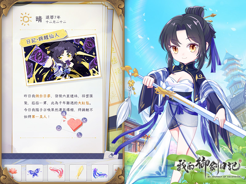 系統、系統是《我的御劍日記》手遊中,讓世界觀更為完整的其中兩個玩法,玩家透過系統可以蒐集各種遊戲內的寶貴資源,而透過系統則是除了展示本身的遊戲內成就之外,還可以進一步獲得獎勵,加快修練的進程。