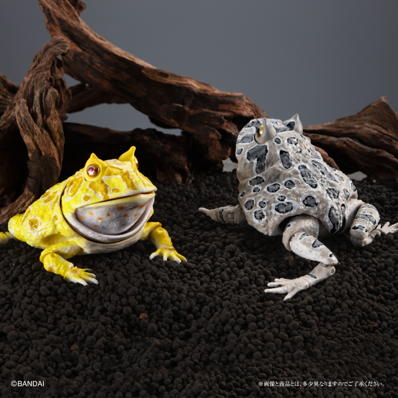 擁有最頂級的尺寸、造型與可動設計的「生物大圖鑑Ultimate(いきもの大図鑑アドバンス)」,相較「生物大圖鑑」商品更具擬真細節和精緻塗裝。本次推出的「生物大圖鑑Ultimate 角蛙」,收錄有:鐘角蛙(綠)、鐘角蛙(紅)、南美角蛙(黃金)、 南美角蛙(灰/紫藤)四種款式。尺寸全長約 70 mm,全身設計有 18 個可動關節,再嘴巴、腿、特色的眼睛等處都可以調整動作,還原可愛又呆萌的姿態。