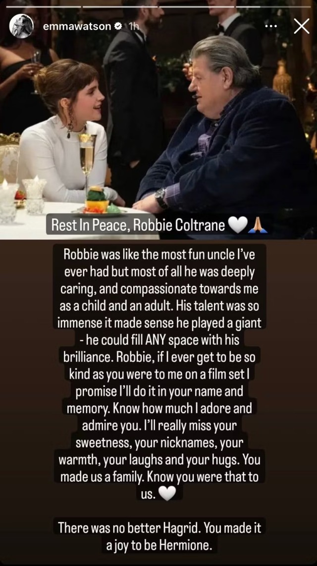 飾演「妙麗」的艾瑪華森(Emma Watson)則在 Instagram 限時動態上如此讚賞柯崔恩:「羅比就像是我身邊最風趣的叔叔,但最重要的是,無論是小時候還是長大後,他都對我很關心,也對我很和藹。他能扮演一個巨人是有其道理的,因為他的才華是如此無限大,以至於他可以用他的才華填滿任何空間。