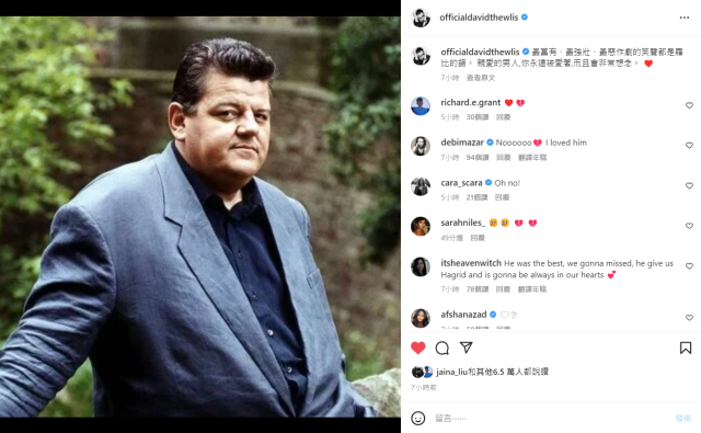 沒有公開社群帳號的「哈利波特」丹尼爾雷德克里夫(Daniel Radcliffe)則透過媒體發聲明:「他在拍《阿茲卡班的逃犯》時為我們提振士氣,是我特別喜歡的一段往事 ,當時我們在海格的小屋躲了好幾小時的暴雨,而他用說笑和講故事的方式來振奮我們精神。我很榮幸能認識他、與他共事,也為他的離去感到難過,他是卓越的演員,也是個親切可愛的人。」