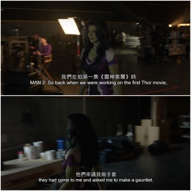 來到《律師女浩克》攝影棚,可以聽到背景有一位設計師正在受訪,談到自己當年在《雷神索爾1》被請來設計無限手套。無限手套在該片只是一閃而過的彩蛋,後來在《雷神索爾:諸神黃昏》也被證實是假貨。
