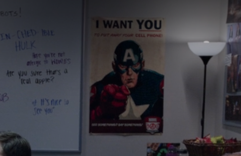 漫威製作組充斥著「美國隊長」的仿二戰徵兵海報,上面寫著「我要你...放下手機」(I want you to put down your cell phone!)因為漫威是出了名的嚴謹保密,因此絕不允許任何內部工作人員將機密外洩。
