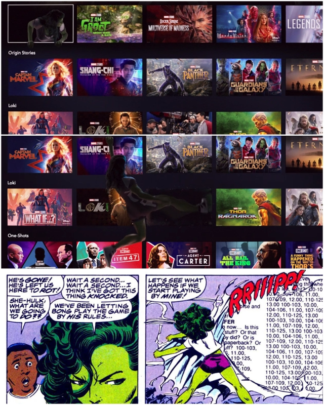不要懷疑!你的 Disney+ 沒有閃退!眼見局面失控,女浩克乾脆直接打破 Disney+ 介面,從《漫威影業:創作大本營》幕後紀錄片中,進入《律師女浩克》的幕後,要與編劇團隊對質。 這種突破第四道牆限制,跟現實生活互動的劇情,經常出現在女浩克或死侍漫畫原作中反覆出現。