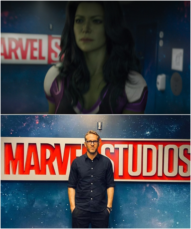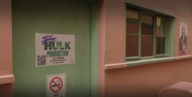 女浩克闖入漫威影業總部,醒目的logo在背景牆上映入眼簾。另一位以「打破第四道牆」聞名的「死侍」萊恩雷諾斯就曾在《死侍3》展開籌備時在這裡拍照留影。