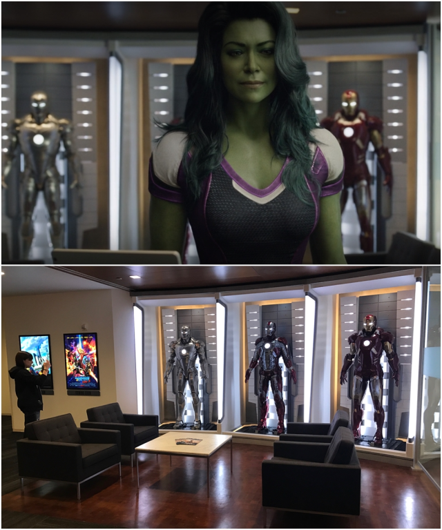 女浩克要求進去和「凱文」見面,背景可以看到三座鋼鐵人戰甲,這裡是漫威影業的會客大廳。