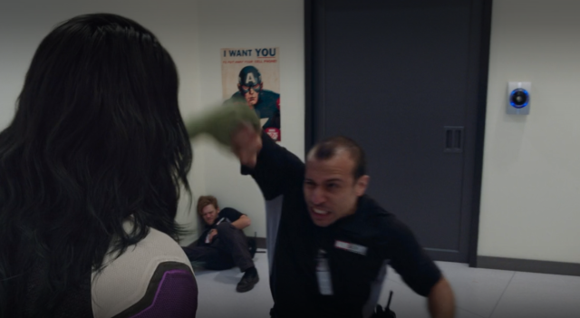 許多維安人員衝出來,要阻止女浩克進入「凱文」的秘密基地,但全都被女浩克一一撂倒。這段很明顯在模仿《鋼鐵人2》中黑寡婦闖入漢默科技的經典橋段。