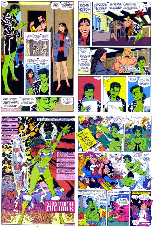 這期漫畫中,《女浩克》作者意外去世了,因此女浩克打破第四道牆,直接肆意大改自己的作品,還把自己變成女雷神、大力水手等角色。