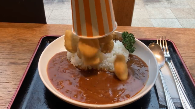 其實這份「落石咖哩」概念滿簡單的,用飲料杯裝的方式將雞塊藏在裏頭,只要把杯子拿起雞塊就會自然像落石一般掉出來,搭配咖哩食用。雖然頗為地獄梗,不過大多數網友都非常喜愛。( 目前該地的道路已經開通 )