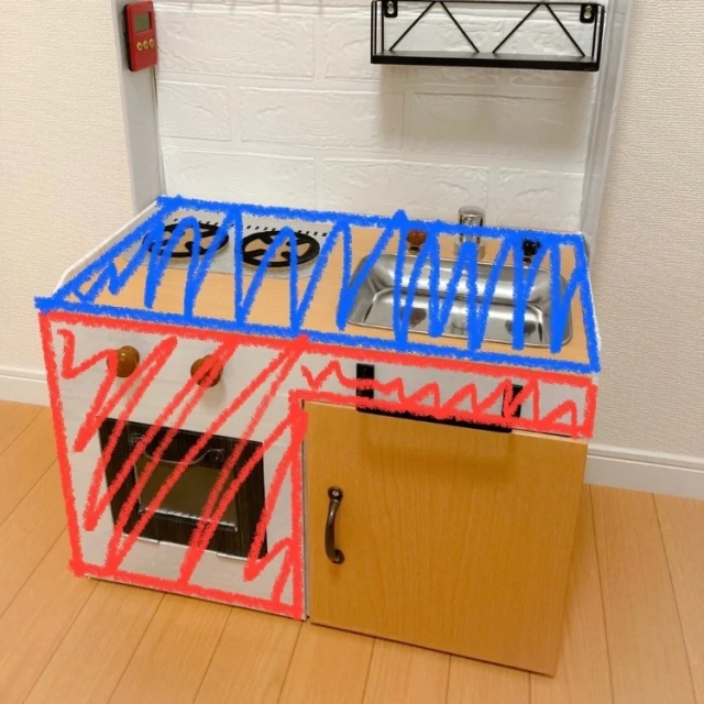 然而在紙箱上部貼上百元商店可購入的木板,裁切後當作廚房工作台;再來廚房的流理臺則使用不鏽鋼托盤,在木板上切出空間後放入,而水龍頭與把手則分別使用洗髮精的擠壓噴嘴與抽屜的旋鈕,廢物再利用。