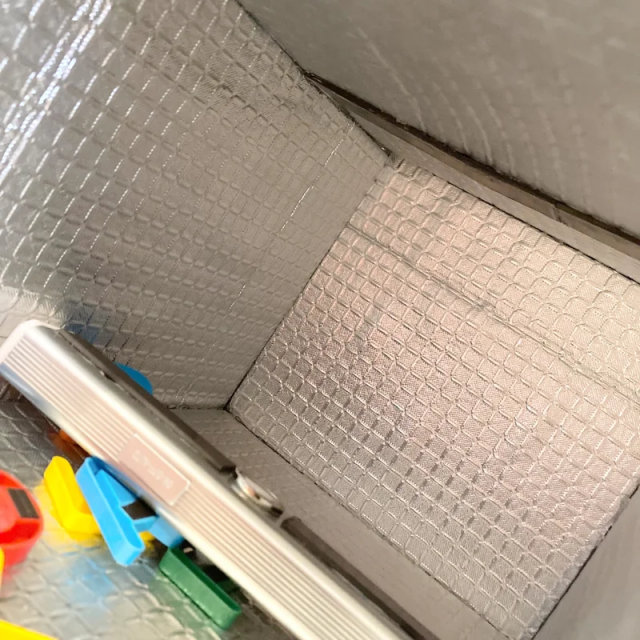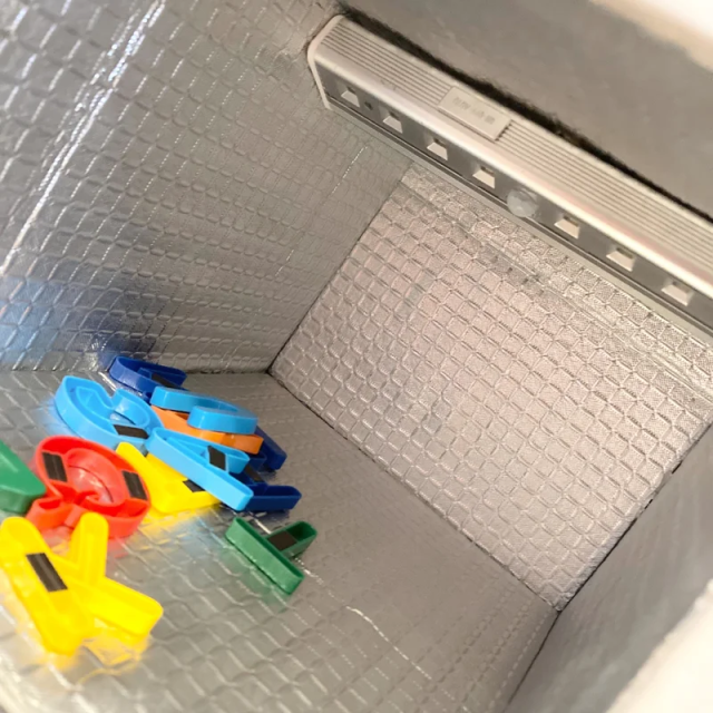 箱子內裡鋪上鋁製隔熱板,並且使用磁鐵將感應式的燈具黏在裏頭。 ( 不過這樣子燈具更換電池不方便,可能還有更好的辦法 )