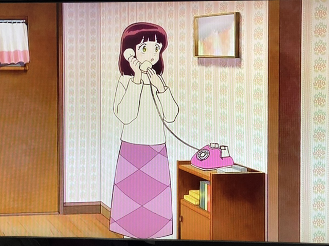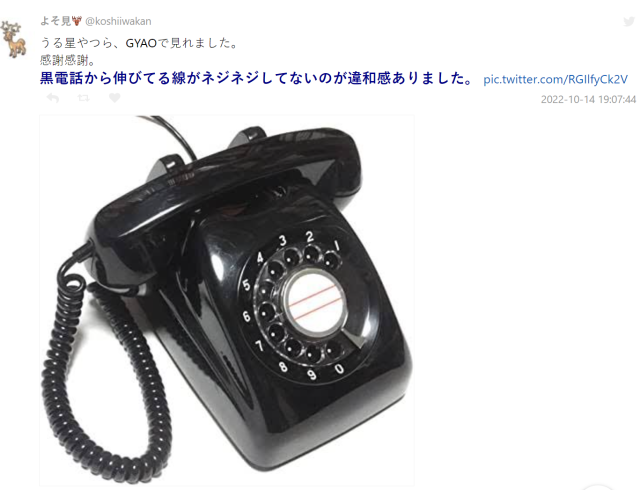 其實就是所謂的家用電話「黑電話」( 日本網友對其的稱呼 ),可以看到不論是主角諸星當家中的,還是同學三宅忍家裡的,都還保有過去傳統家用電話的樣貌。不過有發現異常處嗎 ? 就是話筒與電話的線,居然是直的不是捲曲狀的,讓不少老粉網友感嘆 : 「年輕的製作群或許不曉得了吧...。」