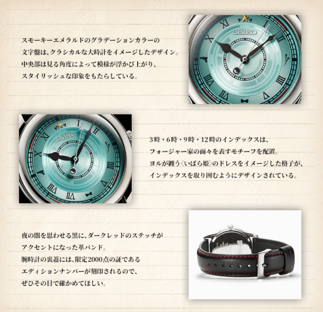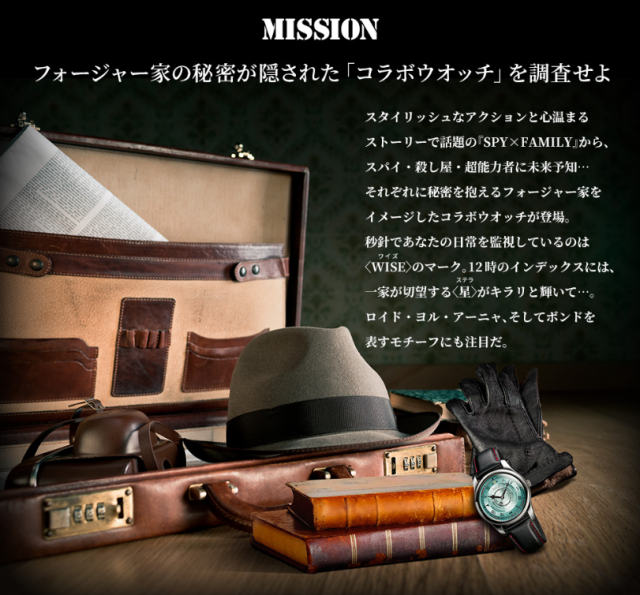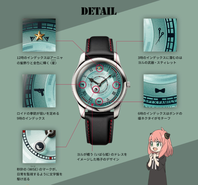 以湖水綠的錶面底色作為基底,錶面數字各處都藏有角色的特色在,包含; 12 點鐘安妮亞的金色髮飾、三點鐘約兒的武器、六點鐘彭德的蝴蝶結領帶、九點鐘洛伊德的手槍,秒針上也有著組織「WISE」的標誌。