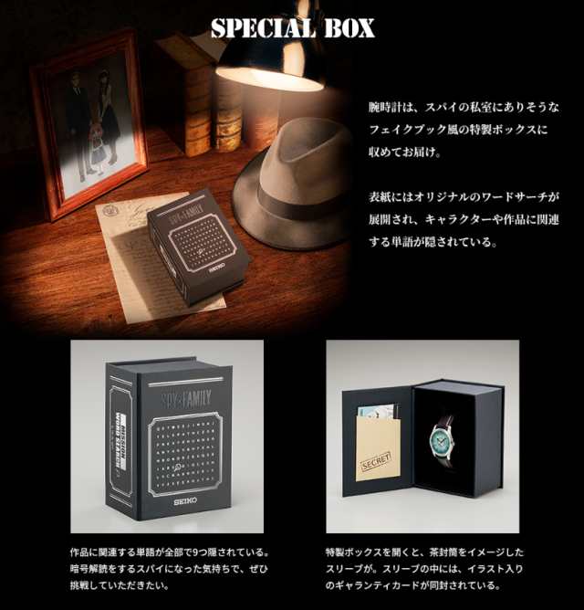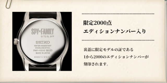日本知名鐘錶製造商「SEIKO」過去已和多項 ACG 相關 IP 合作推出造型錶,也頗受粉絲好評。近日宣布將推出今年人氣動畫之一《SPY×FAMILY間諜家家酒》的限量聯名錶,以佛傑一家人的概念設計而成,限量 2000 組。售價為 32,800 日圓,目前開放於官網預購。
