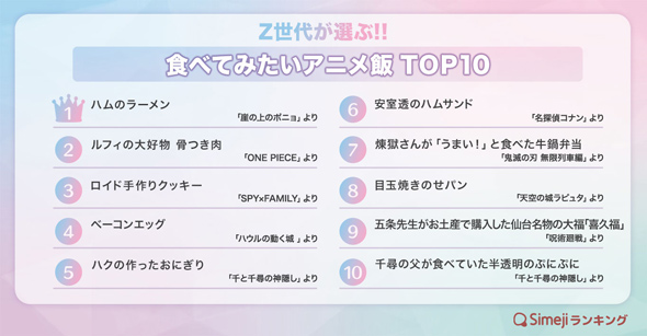 各位動漫粉在觀看動畫的時候,會注意到劇情中出現的料理嗎 ? 有些餐點真的讓人食指大動外,更讓人想嘗試還原到現實之中。最近日本 App「Simeji」提供網路調查分析,選出「最想吃的動畫料理」排行榜的前十名,不妨讓我們來看看到底有哪些東西上榜吧 !