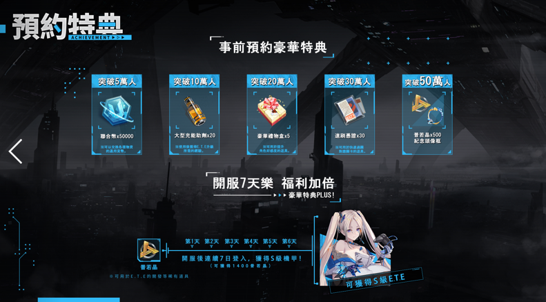 《艾塔紀元》臺港澳事前預約已突破20萬,目前已解鎖「聯合幣50000」、「大型充能助劑*20」、「豪華禮物盒*5」,可用於兌換遊戲初期幫助快速成長的各種重要物資,其中「豪華禮物盒」可用於提升與少女角色好感度!,趕快預約,為心儀的「同步者」少女準備好禮物!更多福利等待解鎖中,一起解鎖豪華特典吧!