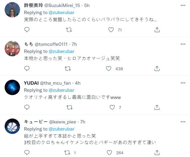 而ズベルバー的創作,也博得大量網友的稱讚,除了覺醒的創意外,更是呼應死柄木吊個性「崩壞」 與巴奇的「四分五裂果實」。更有網友稱讚他的畫技優異,有著尾田老師的韻味。 ( 當然與尾田老師的畫風還是有差異的 )