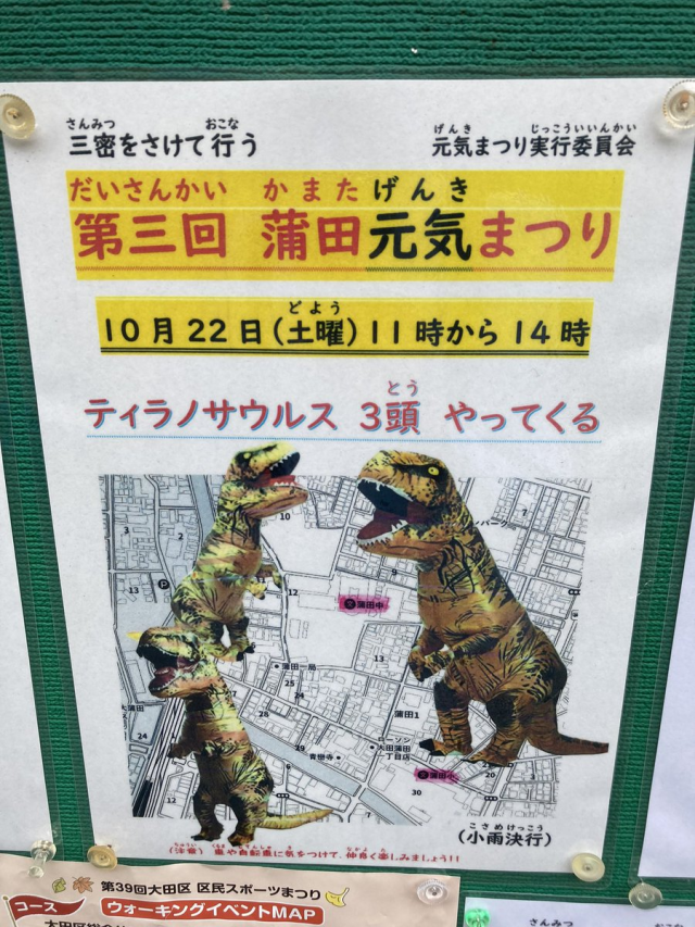 相信對於愛好東京旅遊的朋友,對於臨近羽田機場大田區的「蒲田」地區應該不陌生,電影《正宗哥吉拉》 第二型態的哥吉拉「蒲田君」 在蒲田上陸,讓不少海外粉絲對這個地名更熟悉。最近蒲田地區舉辦了一個地方活動「元氣霸王龍祭典」找來三隻霸王龍裝在城鎮中遊行,成功奪取了行人與網友的注視,也成為推特的熱議話題。
