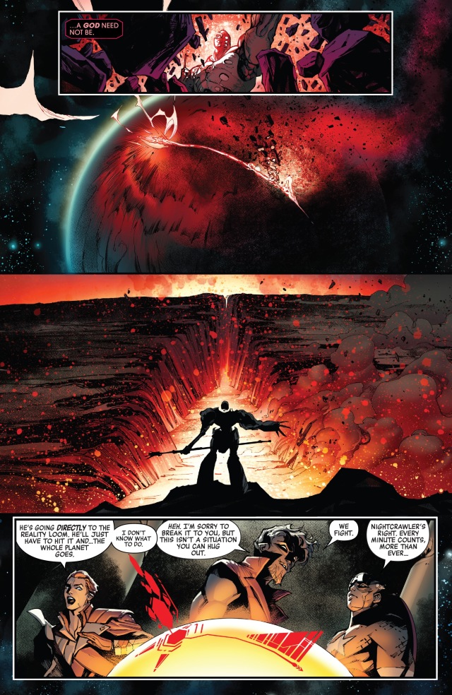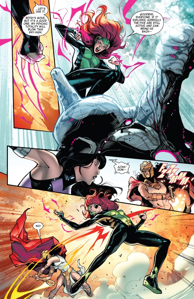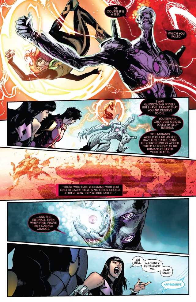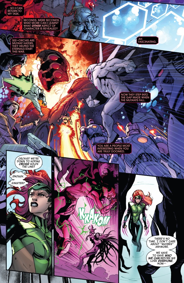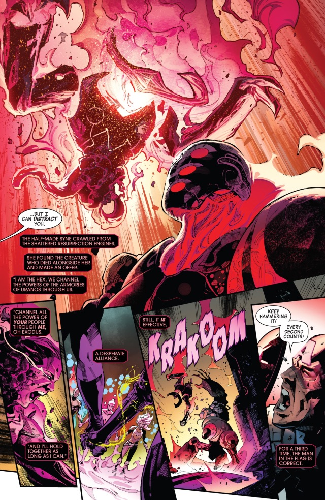 但是那也只是杯水車薪,真正的重頭戲則是永恆族巨獸The Hex成員的Syne和奧米加級變種人出谷(Exodus)的聯手攻擊!透過與其他強大變種人的連結,出谷把無比強大的能量傳送給了Syne,讓她得以與始祖一戰。