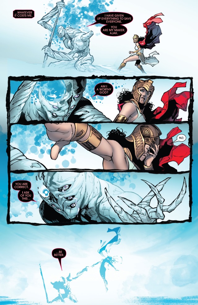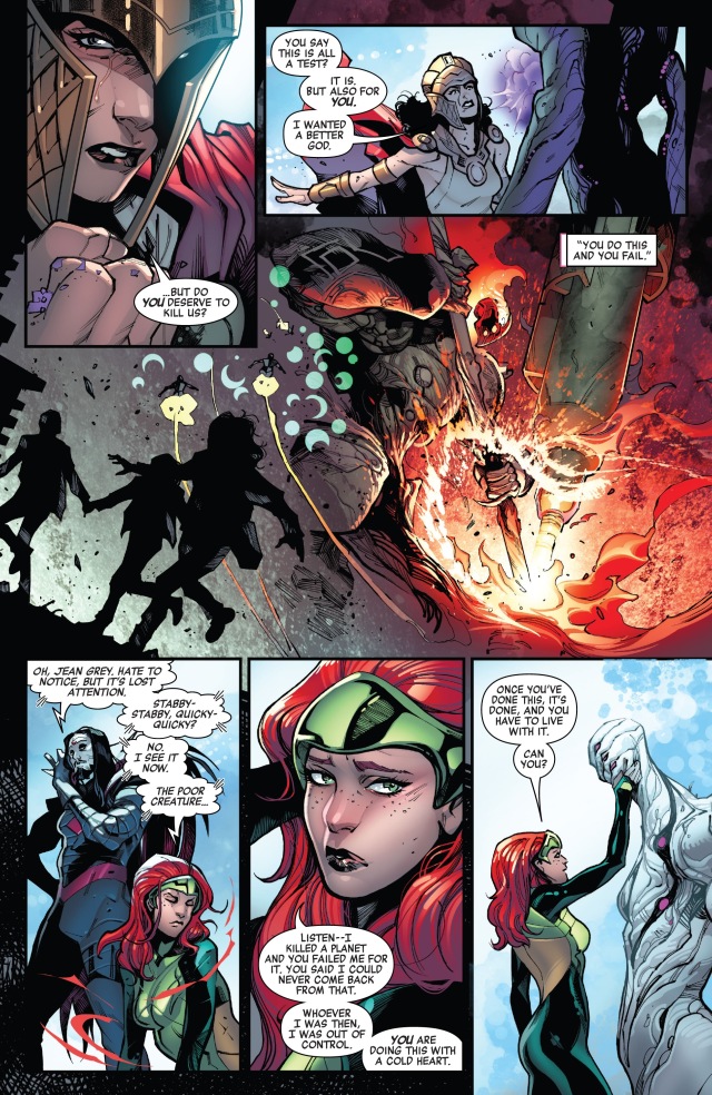 在始祖身體的核心,祂以一種全新的型態存在著。而正當琴(Jean)打算直接解決掉祂時,先前被始祖重新架起精神防火牆的艾賈克(Ajak)卻突然襲擊了她!