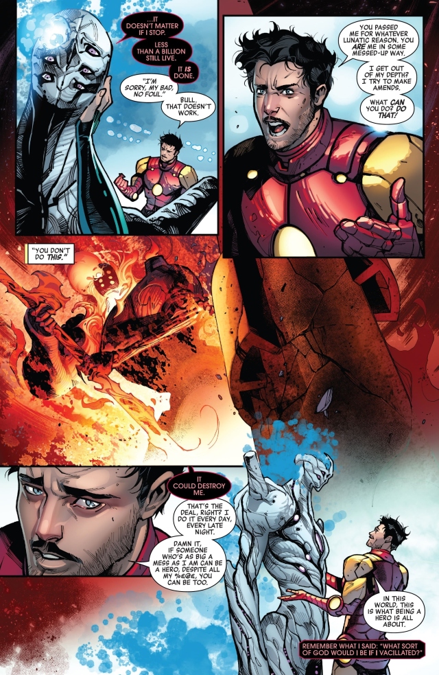 在琴、艾賈克和東尼的勸說之下,始祖理解到自己並沒有那個資格去做出這些決斷。作為鋼鐵人的孩子,祂也繼承了犯下大錯之後再彌補的特性,即使這會在過程中毀掉自己也一樣。
