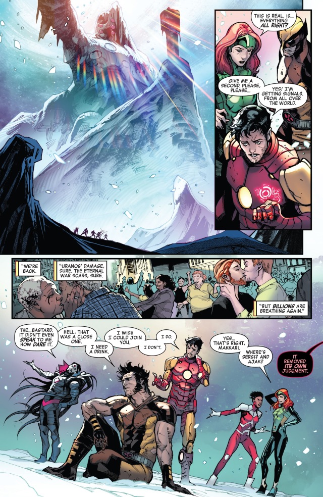所以,大事件《審判日》的主線到此結束,這個世界再次從大浩劫中生還了下來。復仇者們沒有受到明顯的傷害,基地也回復成了原本的模樣;克拉科變種人也許需要花些時間才能恢復島上的生活,但是他們的國際地位卻稍有提升;阿拉科變種人遭受了嚴重的打擊,他們的生活方式也永遠被改變了;永恆族回到了過去的政府,但是瑟希已死,艾賈克則是成為了新的神,同時人類開始認知並唾棄他們的存在。