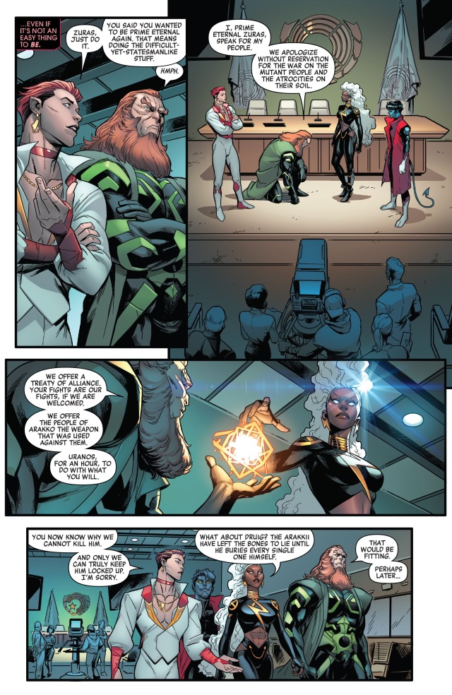 後來,作為重新上任的永恆族至尊,祖拉斯(Zuras)在聯合國上正式向變種人民族道歉,並將一個小時的烏拉諾斯的使用權作為禮物送給了受到最嚴重傷害的阿拉科人(Arakkii)。