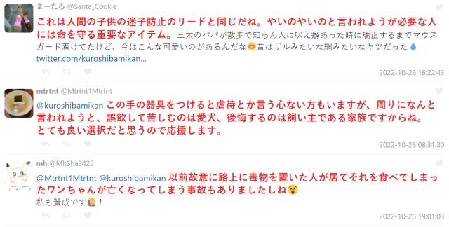不少網友也宣導,雖然會有人認為戴上嘴套毛孩好像很可憐,但絕對是有必要的,尤其有亂吃東西習慣的更應該戴上,避免吃到外面不明的食物造成生病,甚至避免不良人士放置毒物讓毛孩誤食。