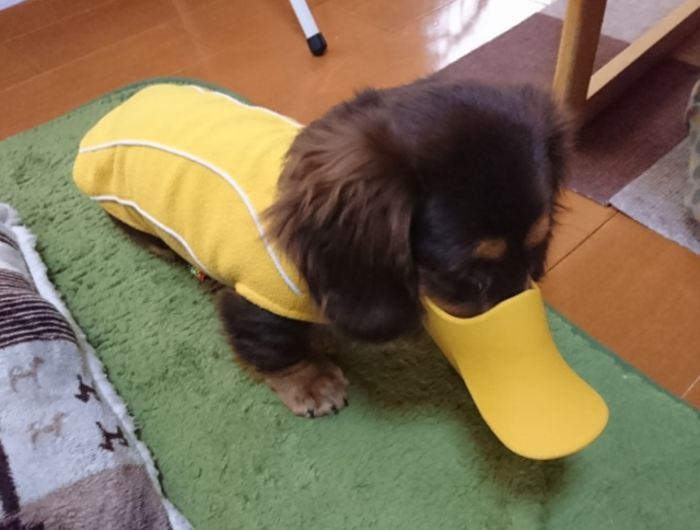 也有其他網友分享同樣戴上「鴨嘴嘴套」的自家毛孩。