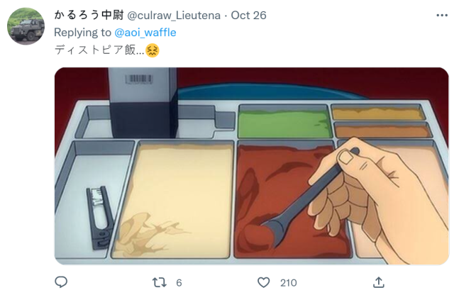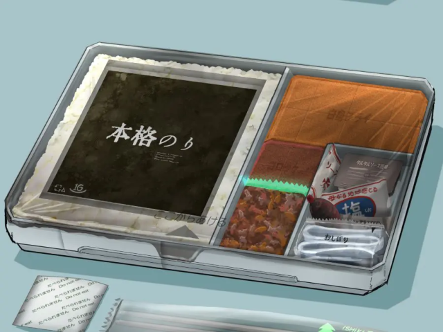 打開後看起來很像是《福音戰士新劇場版 : Q》中的 NERV 伙食,以方塊的方式排列,食材一次粉碎製成的方形薯條和可樂餅,以及切碎的「金平牛蒡」跟調味料。這也是繪師蒼衣わっふる她對未來食物的想像,未來可能有糧食危機的問題,所以這些食材反而格外珍貴。