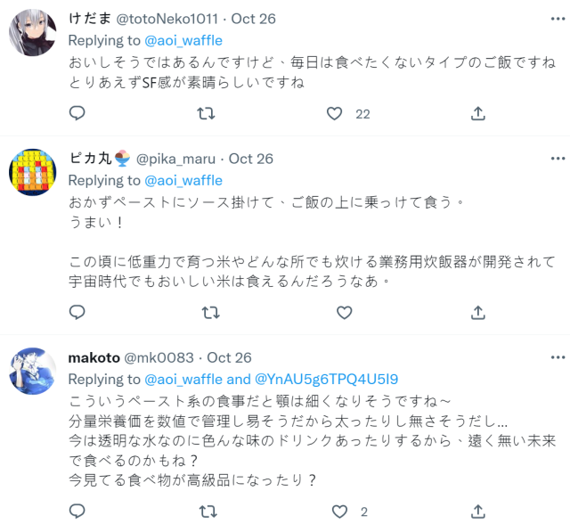 不過蒼衣わっふる具有想像的設計,也讓不少人表達了對於未來食物的想像,看來真的會像是某些科幻作品一樣的思維,過去時代的美食在未來可能格外珍貴。