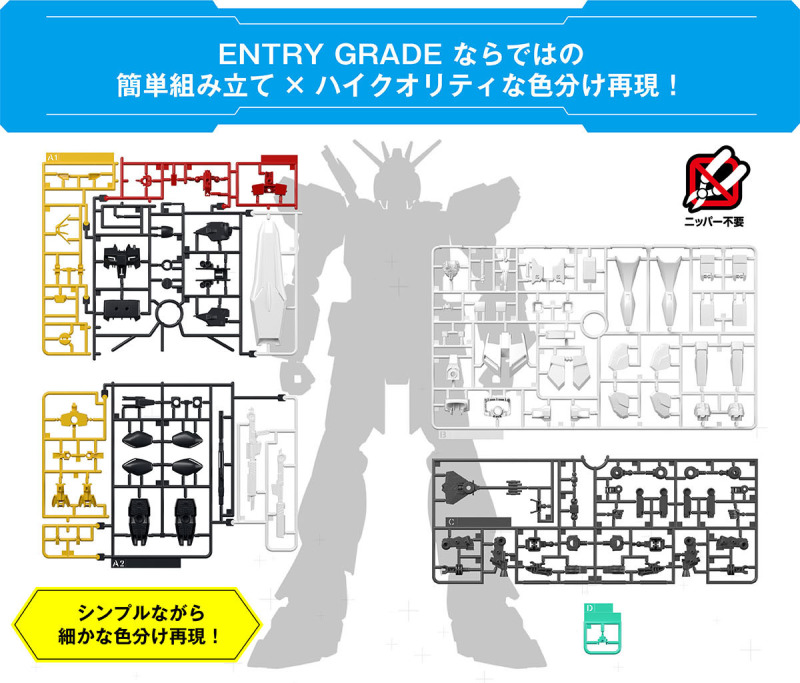 「ENTRY GRADE 1/144 ν鋼彈(7-11限定配色)」基於過去推出的一般版套件製作,為零件約 100 個出頭的入門級組裝模型,零件湯口經過特殊設計,無需使用斜口鉗只要用雙手就能輕鬆將零件拆下,是對孩童與入門者都相當友善的設計。