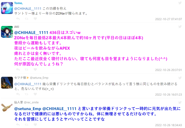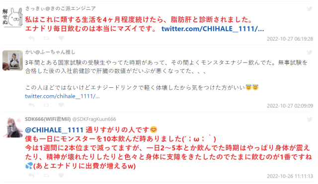 看到推主這樣可怕的行徑,還沒滿 20 歲就天天喝能量飲料,也吸引不少網友來關切。雖然有人戲稱三得利應該感謝他 XD,不過這樣子每天喝真的太傷身,大量的咖啡因很容易造成精神傷害,應該要好好調整作息。另外能量飲料大多也還有高濃度的糖分,有引發糖尿病的風險。