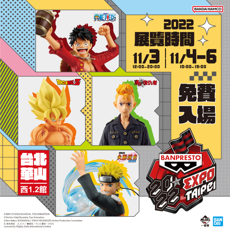 這次在華山展開的【BANPRESTO EXPO 2022】帶來「超人氣經典角色」、「BANPRESTO 品牌系列」與「一番賞」三個展區,內容包含經典動畫《火影忍者》、《航海王》、《七龍珠》、《東京復仇者》......等的人氣角色模型,《鏈鋸人》、《BLEACH 死神》、《我的英雄學院》、《蠟筆小新》、《天竺鼠車車》的系列商品,與多款未上市的新作讓你一睹為快!另外,現場還有《火影忍者》、《航海王》、《七龍珠》的角色主題拍照專區,原汁原味的動畫經典場景讓你一次拍個夠。